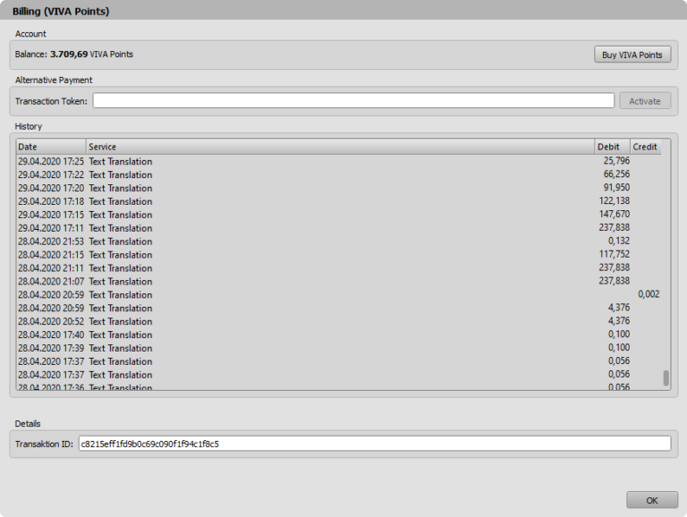 1. Choose Help > Billing (VIVA Points) to call up the account balance in a VIVA program. Each transaction is assigned a unique Transaction ID, which can be used to trace the respective process exactly.